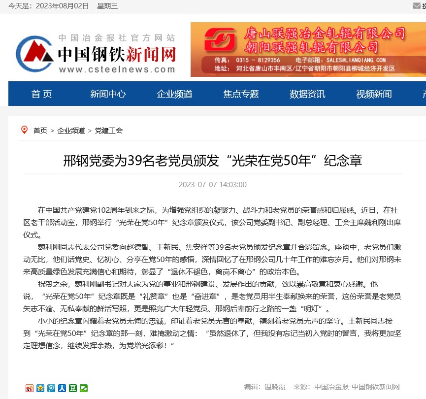 邢鋼黨委為39名老黨員頒發(fā)“光榮在黨50年”紀(jì)念章